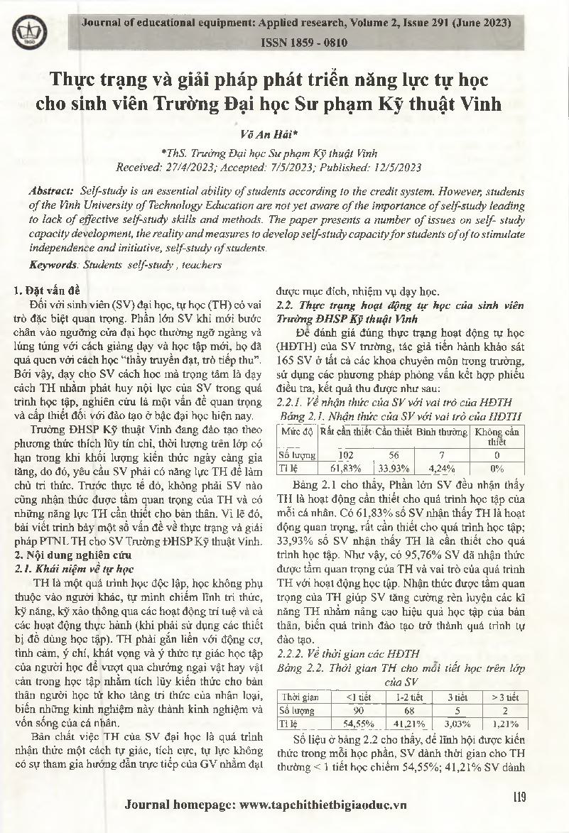 Thực trạng và giải pháp phát triển năng lực tự học cho sinh viên Trường Đại học Sư phạm Kỹ thuật Vinh = Situation and solutions to develop self-study ability for students at Vinh University of Technology Education