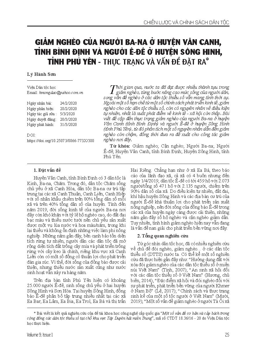 Giảm nghèo của người Ba-Na ở huyện Vân Canh, tỉnh Bình Định và người Ê-Đê ở huyện Sông Hinh, tỉnh Phú Yên - Thực trạng và vấn đề đặt ra = The poverty reduction in the Ba-Na ethnic group, Van Canh district, Binh Dinh province and the E-De ethnic group, Song Hinh district, Phu Yen province - Situation and problems