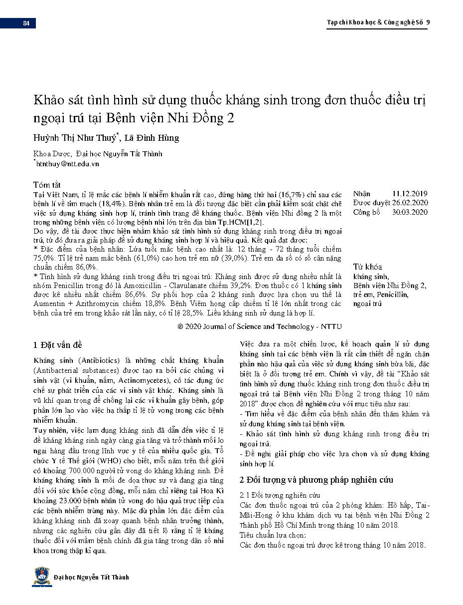 Khảo sát tình hình sử dụng thuốc kháng sinh trong đơn thuốc điều trị ngoại trú tại Bệnh viện Nhi Đồng 2 = Survey the situation of using antibiotics in outpatient prescriptions at The Nhi Dong 2