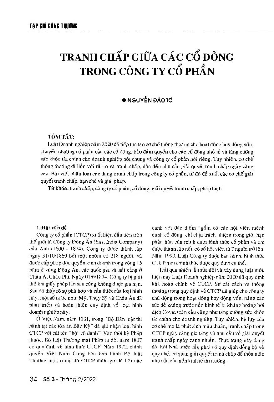 Tranh chấp giữa các cổ đông trong công ty cổ phần = Disputes between shareholders in a joint-stock company