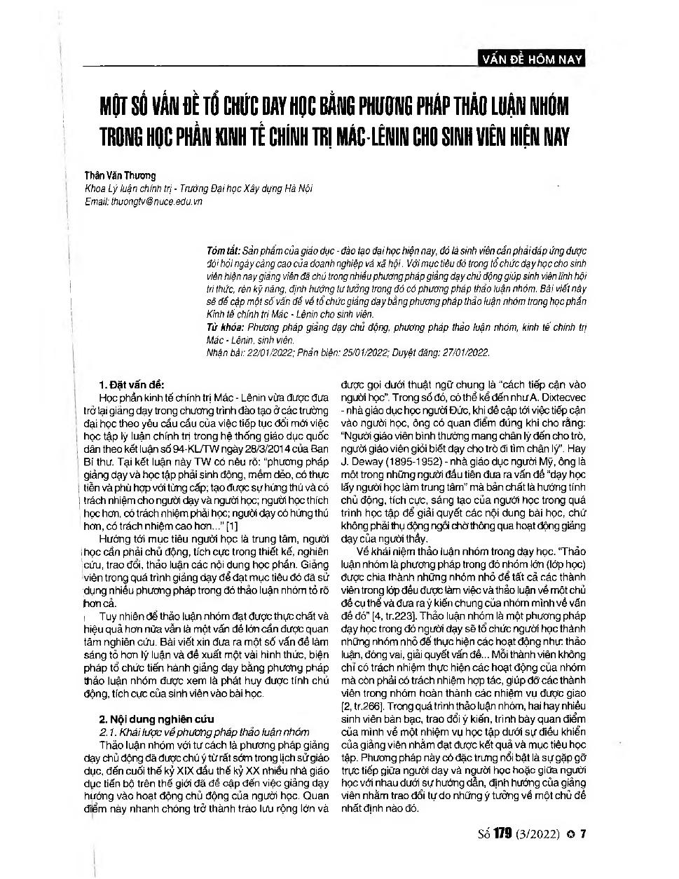 Một số vấn đề tổ chức dạy học bằng phương pháp thảo luận nhóm trong học phần Kinh tế chính trị Mác - Lênin cho sinh viên hiện nay = Some issues in teaching Marxist-Leninist political economy by using group discussion method for the students today