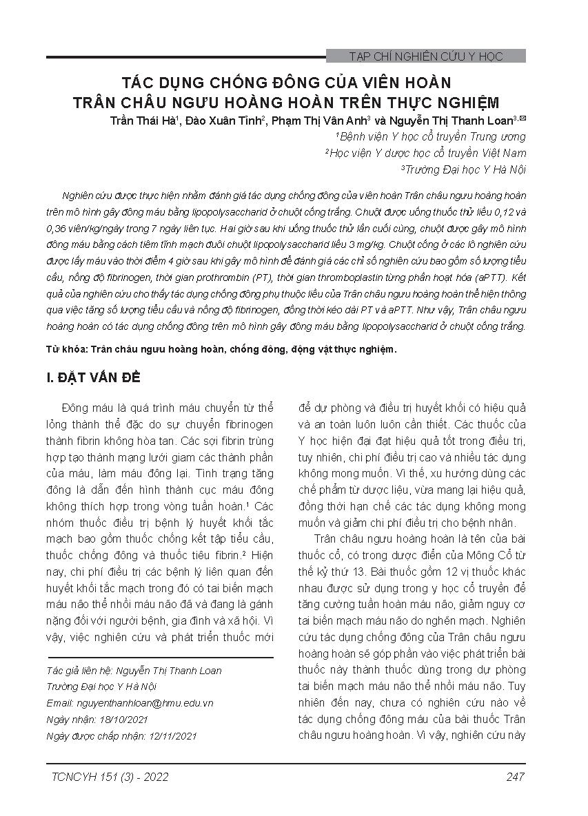 Tác dụng chống đông của viên hoàn trân châu ngưu hoàng hoàn trên thực nghiệm