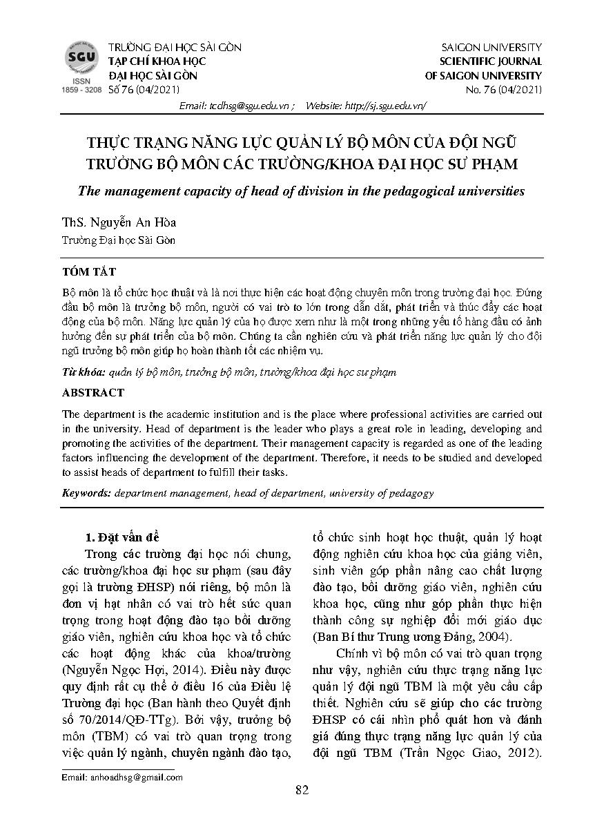 Thực trạng năng lực quản lý bộ môn của đội ngũ trưởng bộ môn các trường/khoa đại học sư phạm = The management capacity of head of division in the pedagogical universities