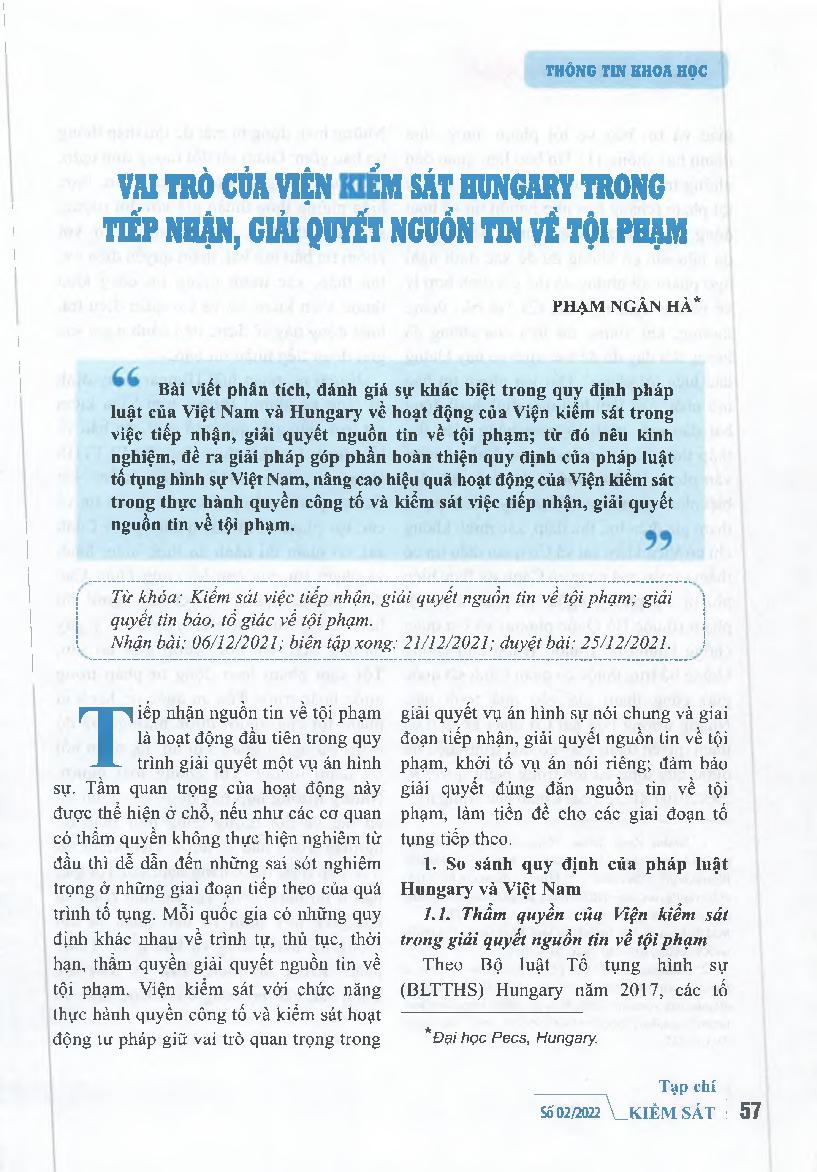 Vai trò của Viện kiểm sát Hungary trong tiếp nhận, giải quyết nguồn tin về tội phạm