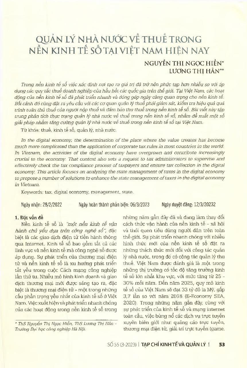 Quản lý nhà nước về thuế trong nền kinh tế số tại Việt Nam hiện nay
