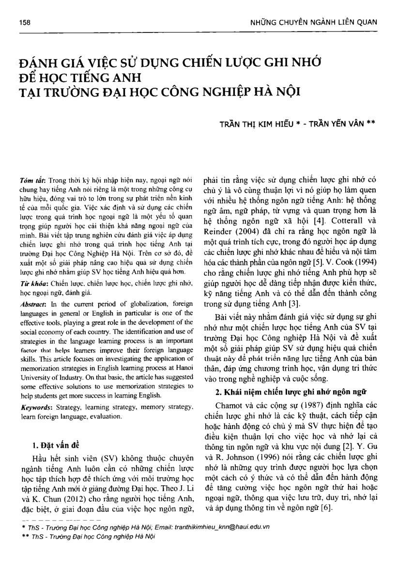 Đánh giá việc sử dụng chiến lược ghi nhớ để học tiếng Anh tại trường Đại học Công nghiệp Hà Nội = Evaluation on using memory strategy to study English of the first year students at Hanoi University of Industry