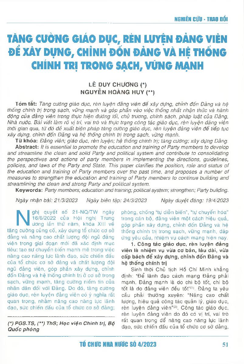 Tăng cường giáo dục, rèn luyện đảng viên để xây dựng, chỉnh đốn đảng và hệ thống chính trị trong sạch, vững mạnh = Promoting the education and training of Party members to develop and streamline the clean and solid Party and political system