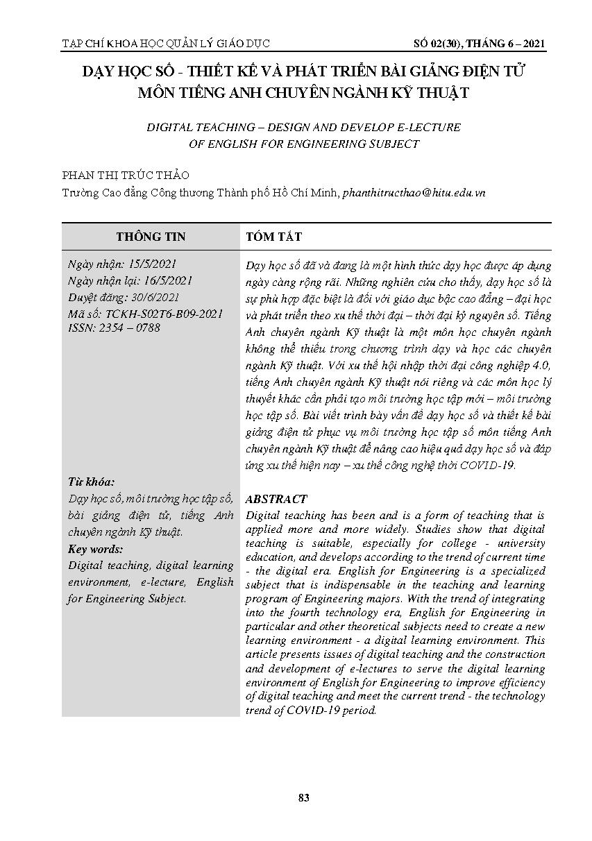 Dạy học số - thiết kế và phát triển bài giảng điện tử môn tiếng Anh chuyên ngành kỹ thuật = DIGITAL TEACHING – DESIGN AND DEVELOP E-LECTURE OF ENGLISH FOR ENGINEERING SUBJECT