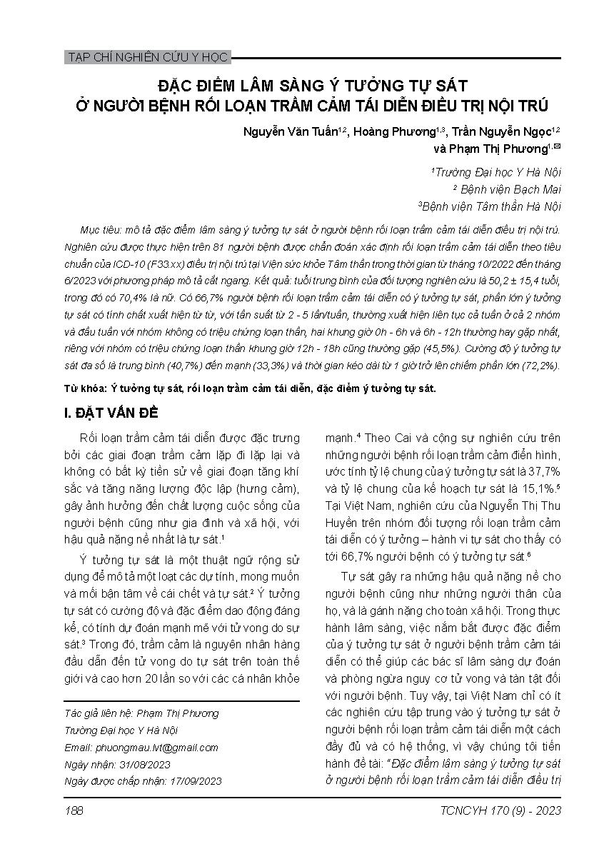 Đặc điểm lâm sàng ý tưởng tự sát ở người bệnh rối loạn trầm cảm tái diễn điều trị nội trú = Clinical features of suicidal ideation in inpatients with recurrent depressive disorder