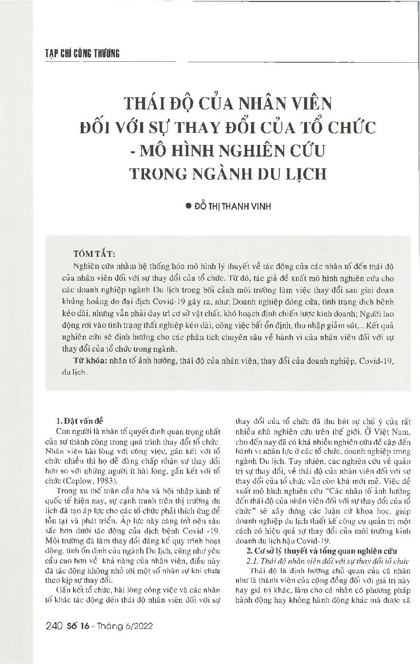 Thái độ của nhân viên đối với sự thay đổi của tổ chức - mô hình nghiên cứu trong ngành Du lịch = The attitude of employees towards organizational changes: A research model for the tourism industry