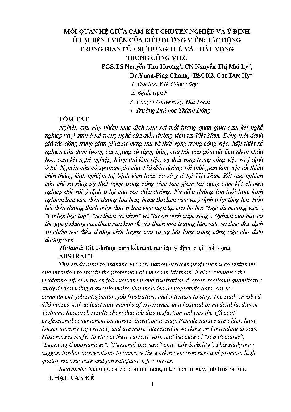 Mối quan hệ giữa cam kết chuyên nghiệp và ý định ở lại bệnh viện của điều dưỡng viên : tác động trung gian của sự hứng thú và thất vọng trong công việc = The relationship between professional commitment and nurses&; 39; intention to stay in the hospital: m