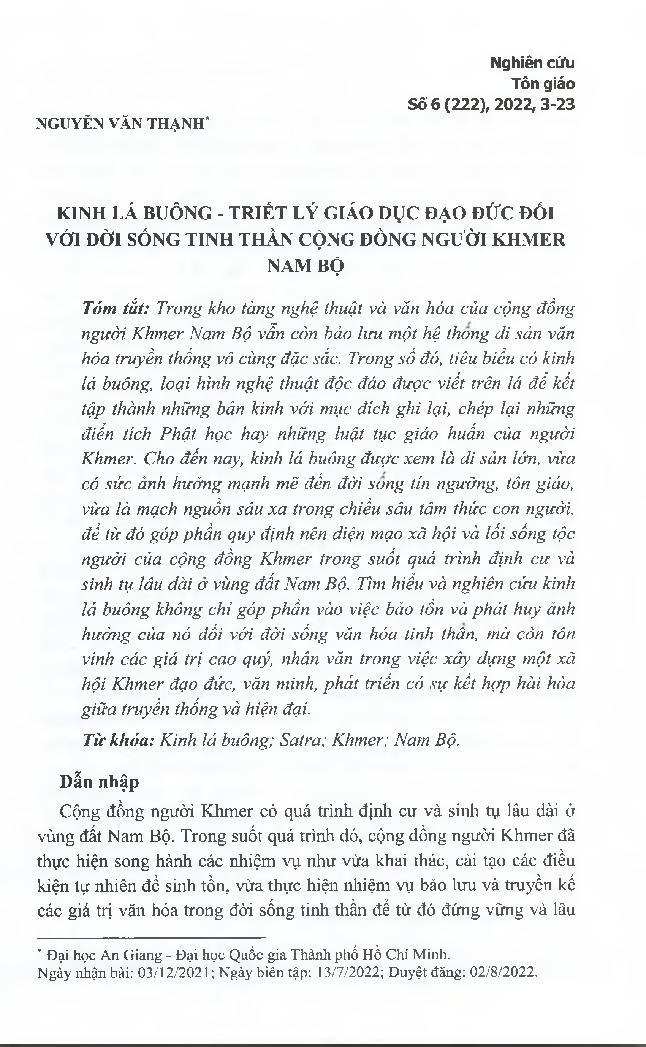Kinh lá buông - triết lý giáo dục đạo đức đối với đời sống tinh thần cộng đồng người Khmer Nam Bộ = Palm-leaf manuscripts - philosophy of ethical education for the Khmer community’s spiritual life in the South Vietnam