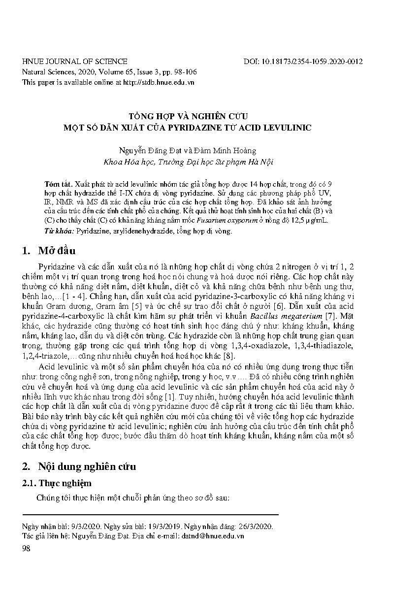 Tổng hợp và nghiên cứu một số dẫn xuất của Pyridazine từ acid Levulinic = Synthesis and study of some derivatives of pyridazine from levulinic acid