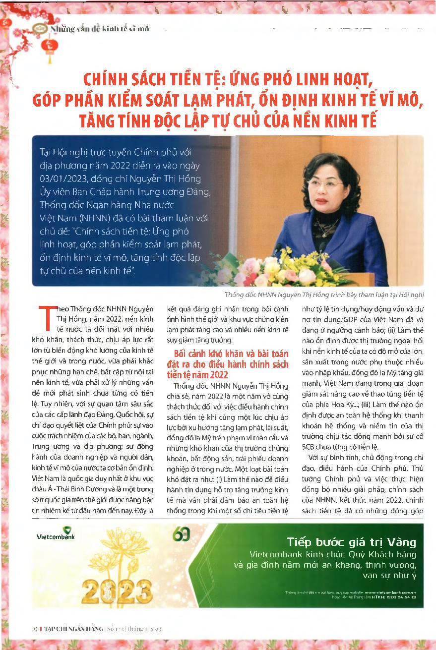 Chính sách tiền tệ: Ứng phó linh hoạt, góp phần kiểm soát lạm phát, ổn định kinh tế vĩ mô, tăng tính độc lập tự chủ của nền kinh tế = Monetary policy: Flexible response, contributing to controlling inflation, stabilizing the macro-economy, increasing the