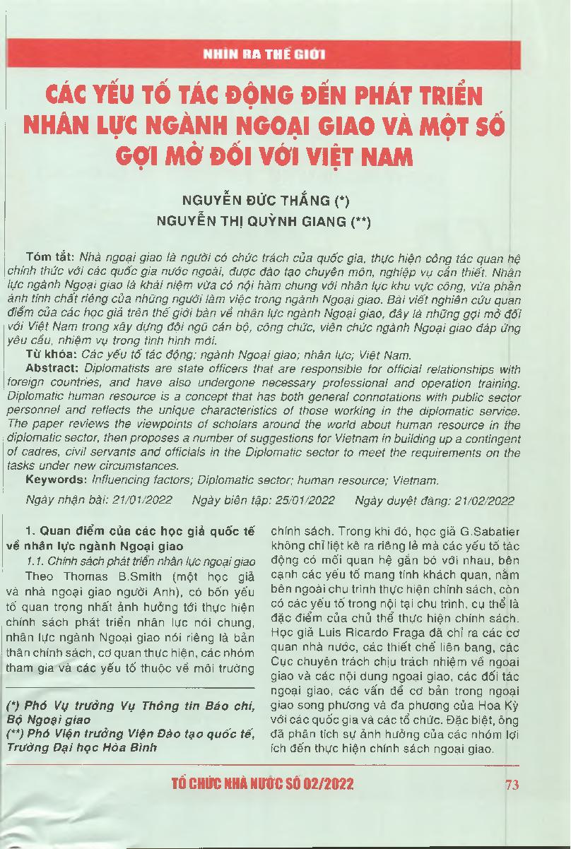 Các yếu tố tác động đến phát triển nhân lực ngành ngoại giao và một số gợi mở đối với Việt Nam = Factors influencing the development of diplomatic human resource and suggestions for Vietnam