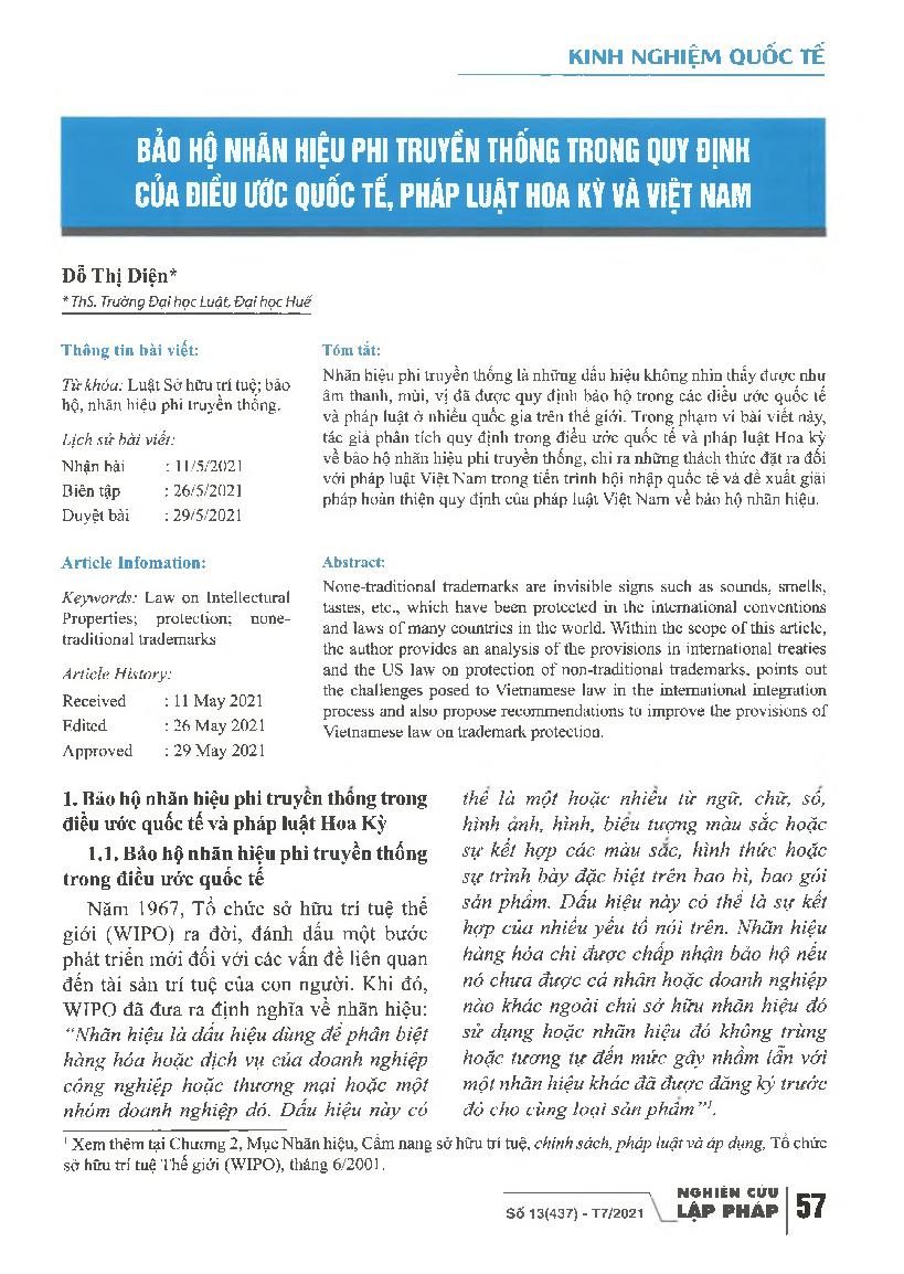 Bảo hộ nhãn hiệu phi truyền thống trong quy định của điều ước quốc tế, pháp luật Hoa Kỳ và Việt Nam