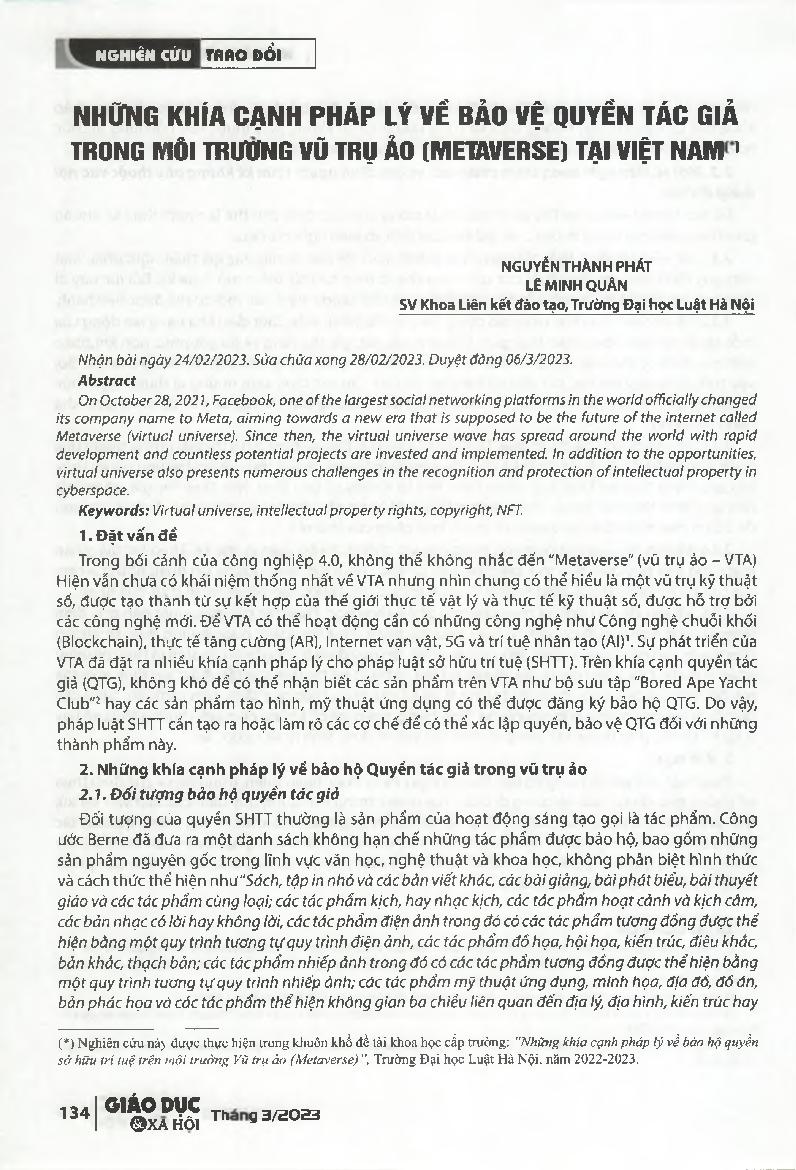 Những khía cạnh pháp lý về bảo vệ quyền tác giả trong môi trường vũ trụ ảo (Metaverse) tại Việt Nam = Legal aspects of copyright protection inthe virtual space environment (Metaverse) in Vietnam