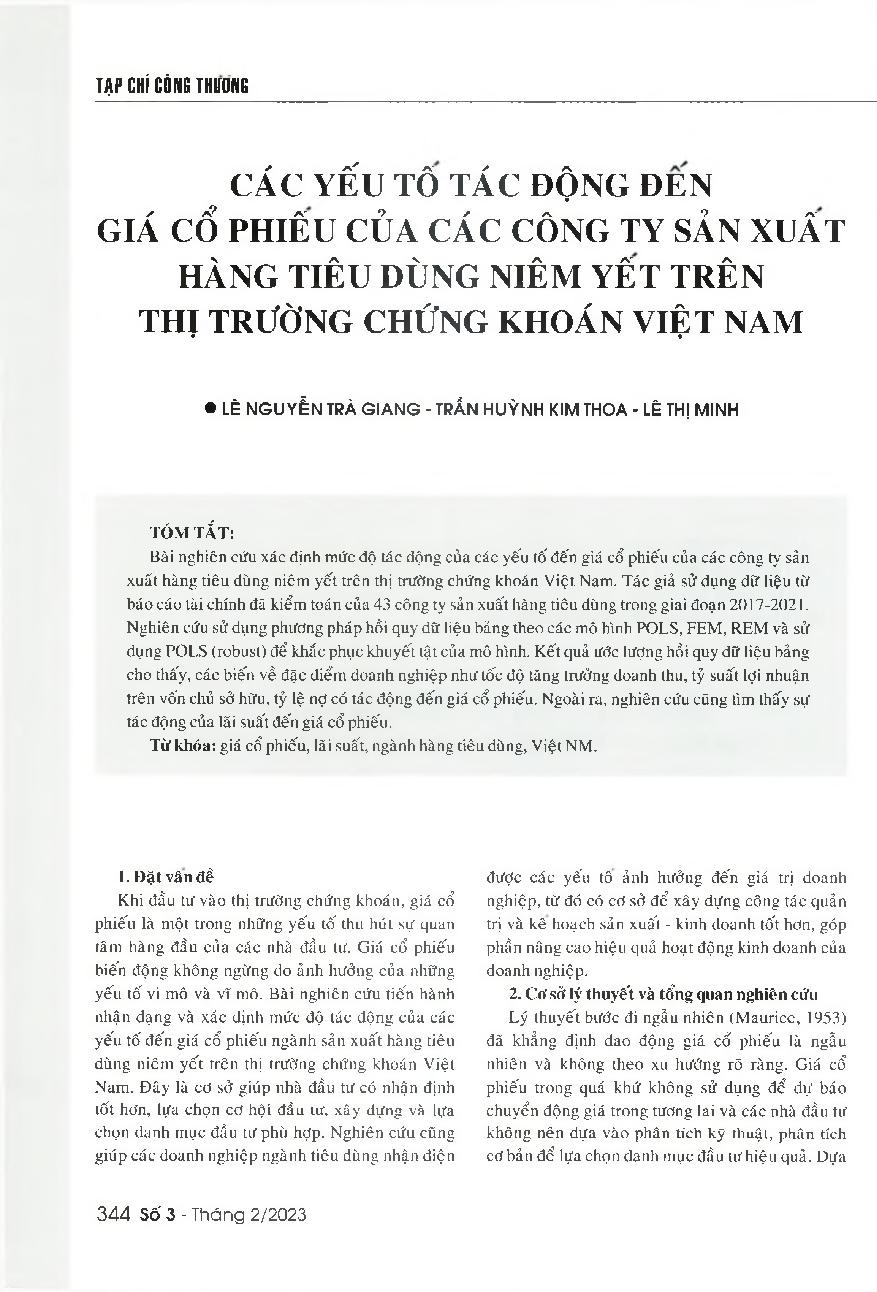 Các yếu tố tác động đến giá cổ phiếu của các công ty sản xuất hàng tiêu dùng niêm yết trên thị trường chứng khoán Việt Nam = The determinants of stock prices of listed consumer goods companies in Vietnam