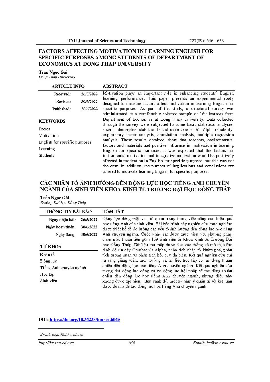 Các nhân tố ảnh hưởng đến động lực học tiếng anh chuyên ngành của sinh viên khoa kinh tế trường đại học Đồng Tháp = Factors affecting motivation in learning english for specific purposes among students of department of economics at dong thap university
