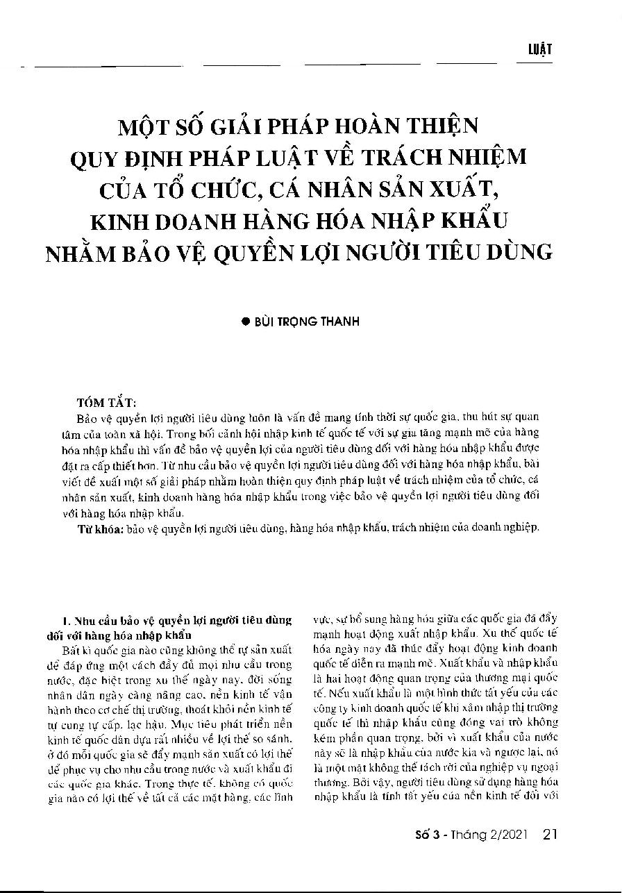 Một Số giải pháp hoàn thiện quy định pháp luật về trách nhiệm của tổ chức, cá nhân sản xuất, kinh doanh hàng hóa nhập khẩu nhằm bảo vệ quyền lợi người tiêu dùng = Some solutions to perfect legal provisions on responsibilities of organizations and individuals who produce and distribute imported goods in order to better protect consumer rights
