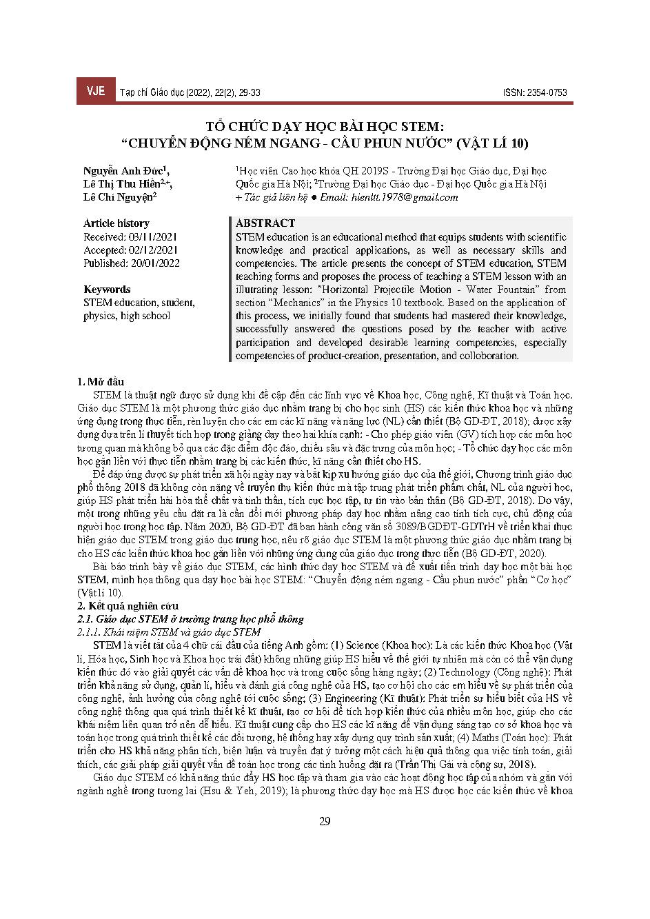 Tổ chức dạy học bài học stem: “chuyển động ném ngang - cầu phun nước” (vật lí 10) = Organization of teaching stem lesson: "horizontal throwing motion - water jet" (physics 10)