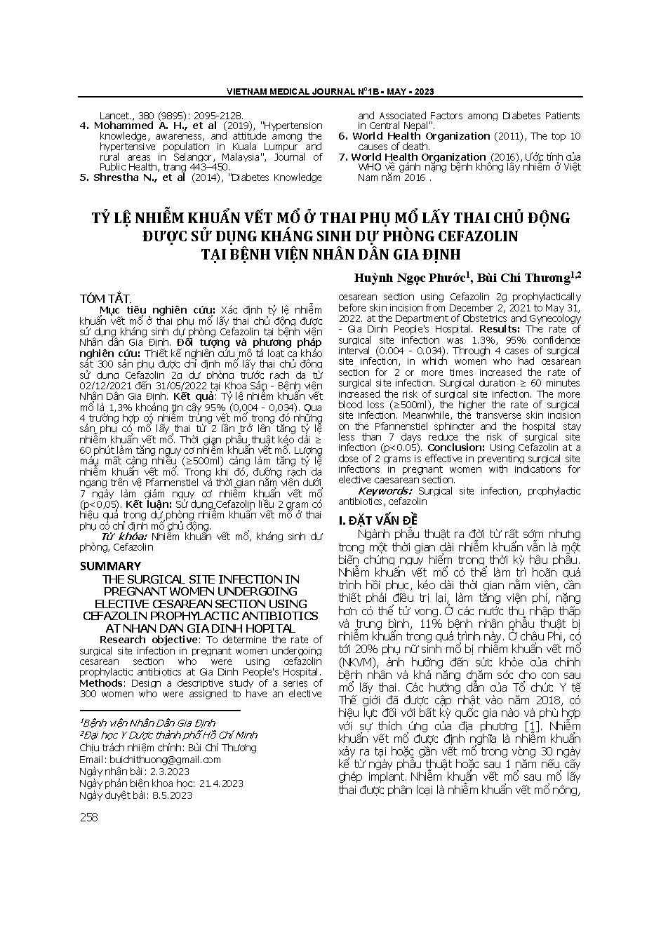 Tỷ lệ nhiễm khuẩn vết mổ ở thai phụ mổ lấy thai chủ động được sử dụng kháng sinh dự phòng cefazolin tại Bệnh viện Nhân dân Gia Định = The surgical site infection in pregnant women undergoing elective cesarean section using cefazolin prophylactic antibioti