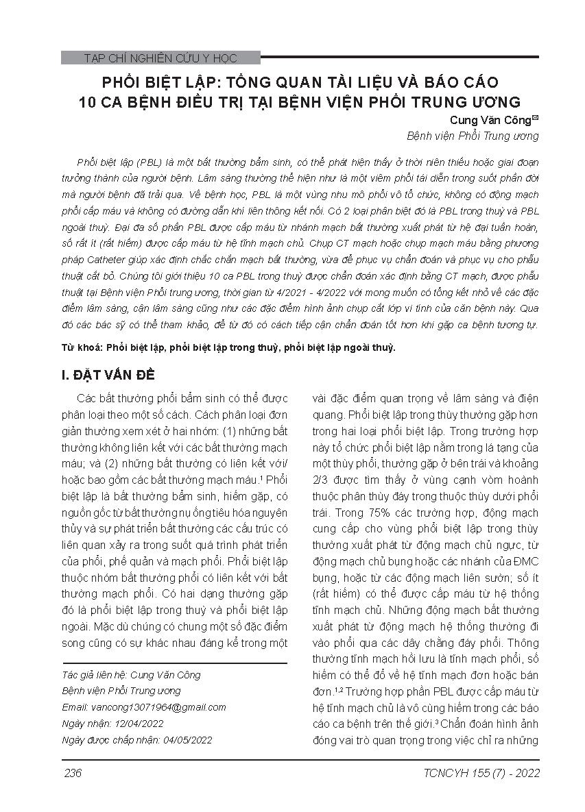Phổi biệt lập: Tổng quan tài liệu và báo cáo 10 ca bệnh điều trị tại Bệnh viện Phổi Trung ương = Pulmonary sequestration: literature review and report of 10 cases treated at the national lung hospital