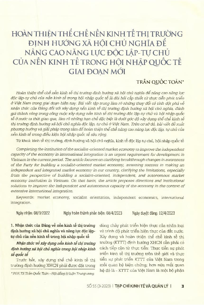 Hoàn thiện thể chế nền kinh tế thị trường định hướng xã hội chủ nghĩa để nâng cao năng lực độc lập - tự chủ của nền kinh tế trong hội nhập quốc tế giai đoạn mới