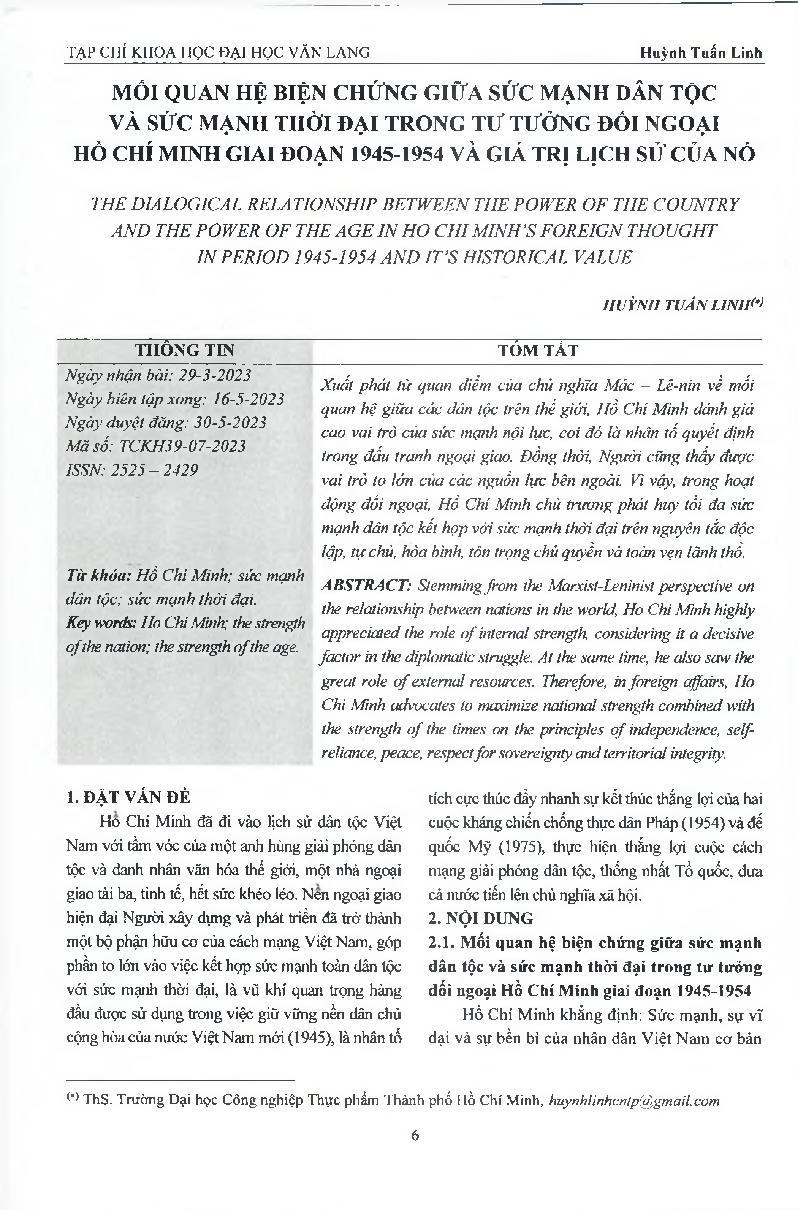 Mối quan hệ biện chứng giữa sức mạnh dân tộc và sức mạnh thời đại trong tư tưởng đối ngoại Hồ Chí Minh giai đoạn 1945-1954 và giá trị lịch sử của nó