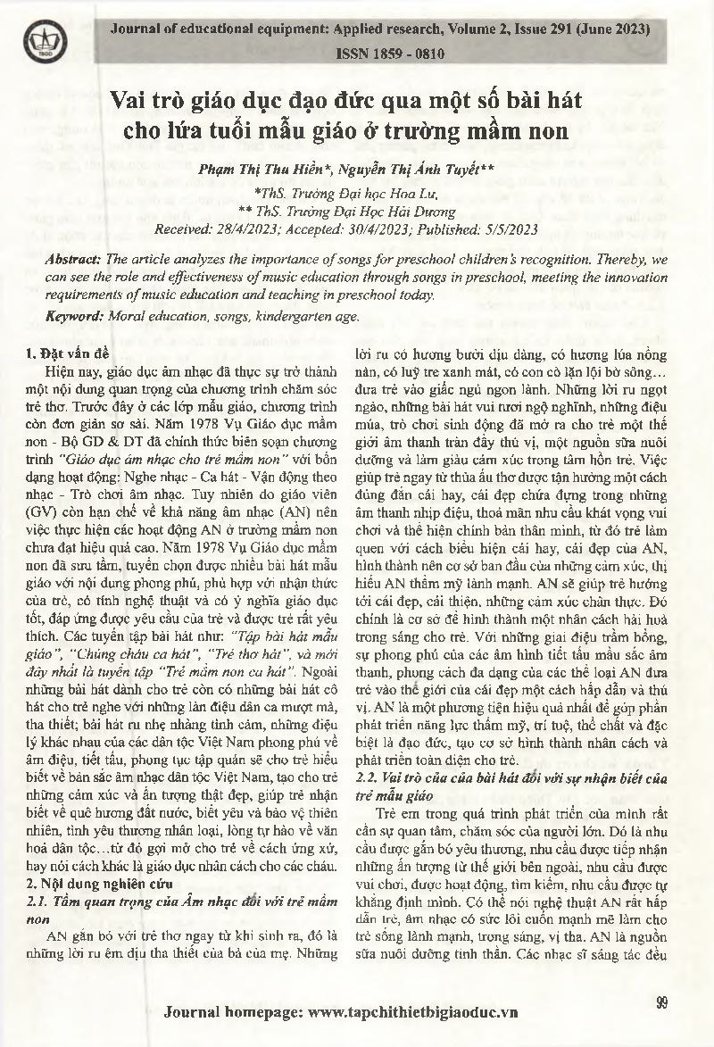 Vai trò giáo dục đạo đức qua một số bài hát cho lứa tuổi mẫu giáo ở trường mầm non = The role of moral education through some songs for preschool children