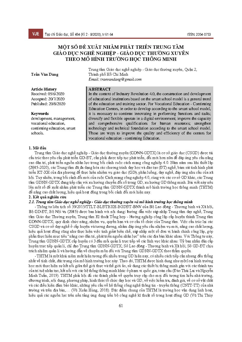 Một số đề xuất nhằm phát triển trung tâm giáo dục nghề nghiệp - giáo dục thường xuyên theo mô hình trường học thông minh = Some proposals to develop vocational education centers - continuing education according to the smart school model