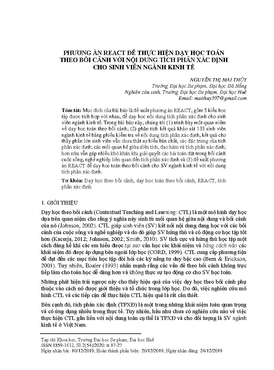 Phương án REACT để thực hiện dạy học toán theo bối cảnh với nội dung tích phân xác định cho sinh viên ngành kinh tế = The react strategy to implement contextual teaching and learning definite integrals for economics students