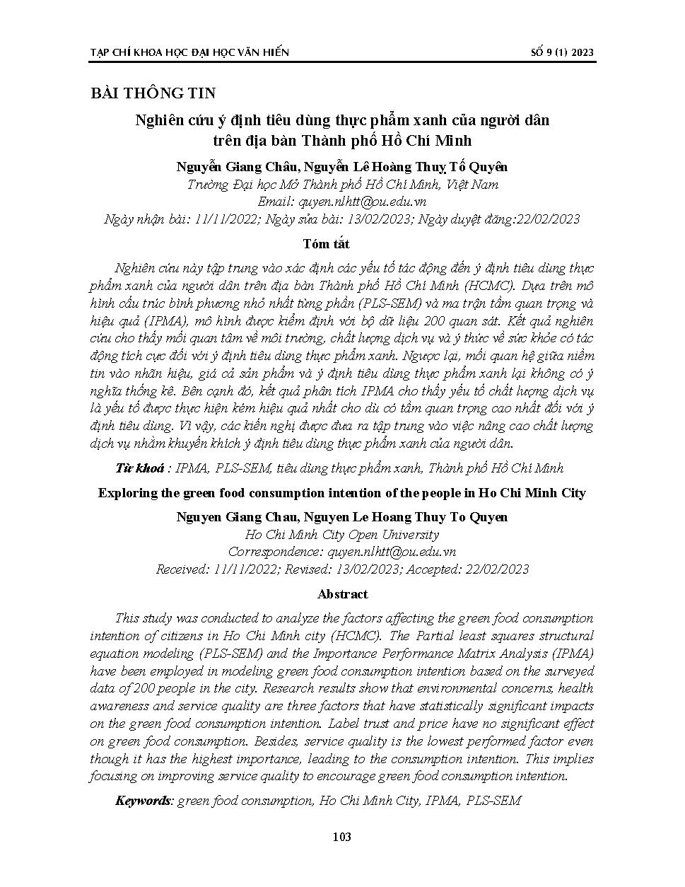 Nghiên cứu ý định tiêu dùng thực phẩm xanh của người dân trên địa bàn Thành phố Hồ Chí Minh = Exploring the green food consumption intention of the people in Ho Chi Minh City