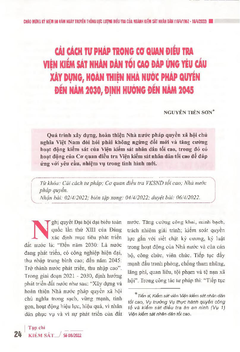 Cải cách tư pháp trong Cơ quan điều tra Viện kiểm sát nhân dân tối cao đáp ứng yêu cầu xây dựng, hoàn thiện Nhà nước pháp quyền đến năm 2030, định hướng đến năm 2045