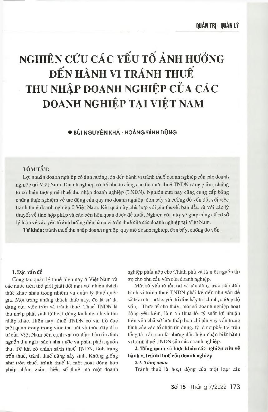 Nghiên cứu các yếu tố ảnh hưởng đến hành vi tránh thuế thu nhập doanh nghiệp của các doanh nghiệp tại Việt Nam = A study on the factors affecting the corporate income tax evasion behavior of Vietnamese companies