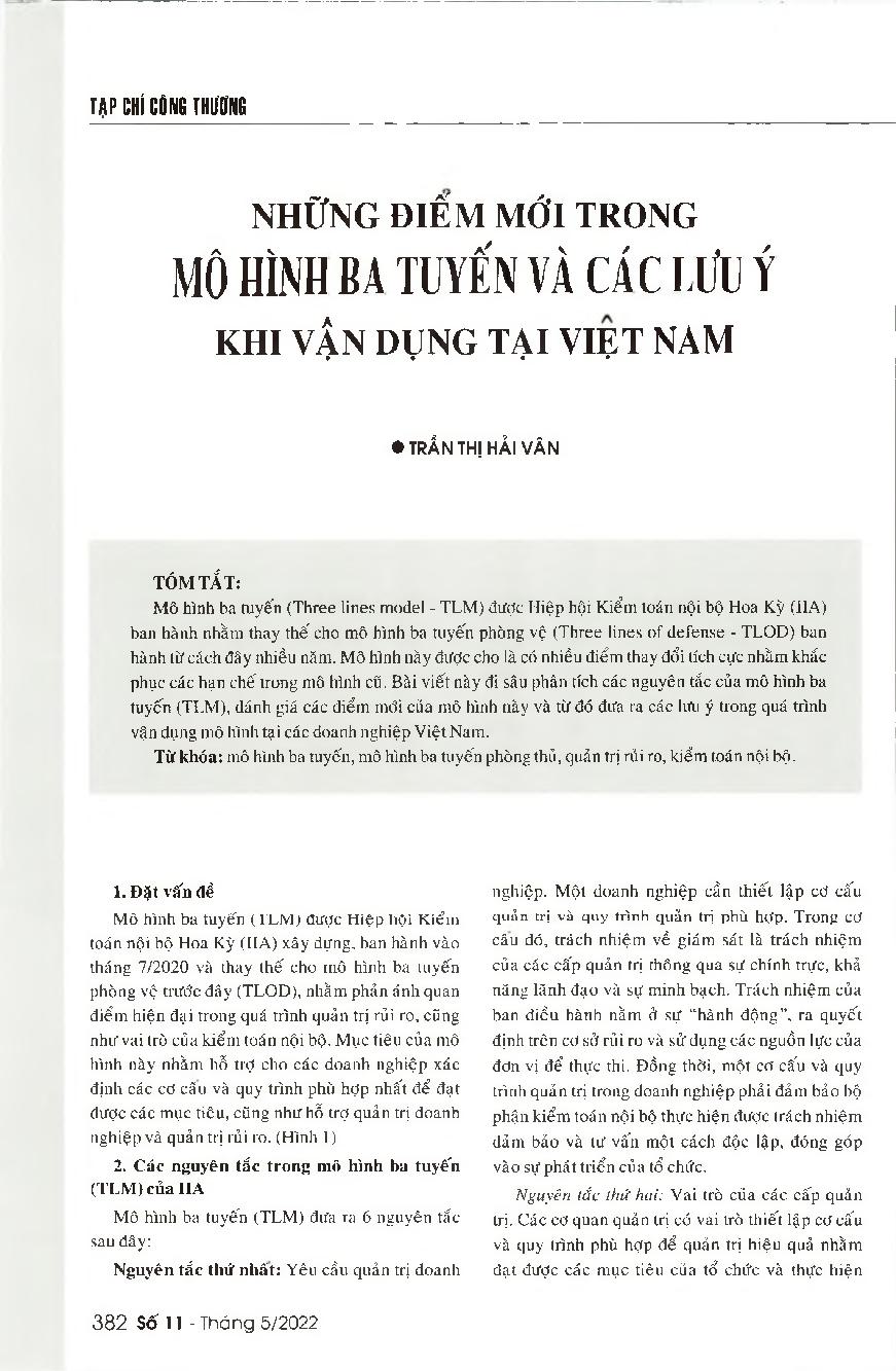 Những điếm mới trong mô hình ba tuyến và các lưu ý khi vận dụng tại Việt Nam = New points of the Three lines model and some notes for the implementation of this model in Vietnamese enterprises