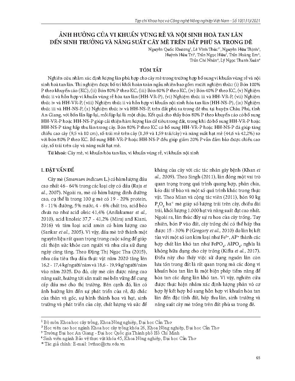 Ảnh hưởng của vi khuẩn vùng rễ và nội sinh hoà tan lân đến sinh trưởng và năng suất cây mè trên đất phù sa trong đê = Effects of rhizospheric and endophytic bacteria possessing ability of P-solubilizing on growth and yield of sesame cultivated in alluvial soil in dyke