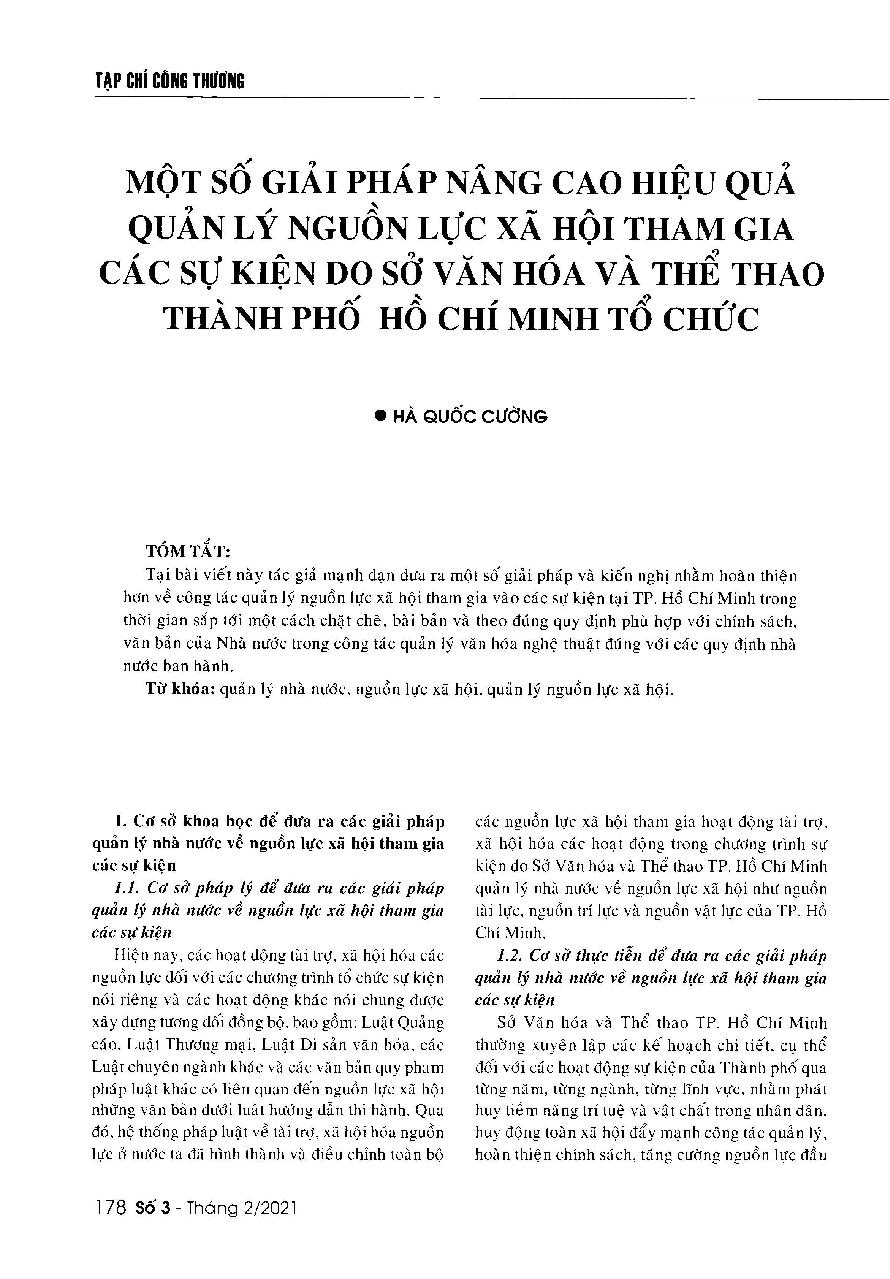 Một số giải pháp nâng cao hiệu quả quản lý nguồn lực xã hội tham gia các sự kiện do Sở Văn hóa và Thể thao Thành phố Hồ Chí Minh tổ chức = Some solutions to improve the social resources management in events holding by the Ho Chi Minh City Department of Culture and Sports.