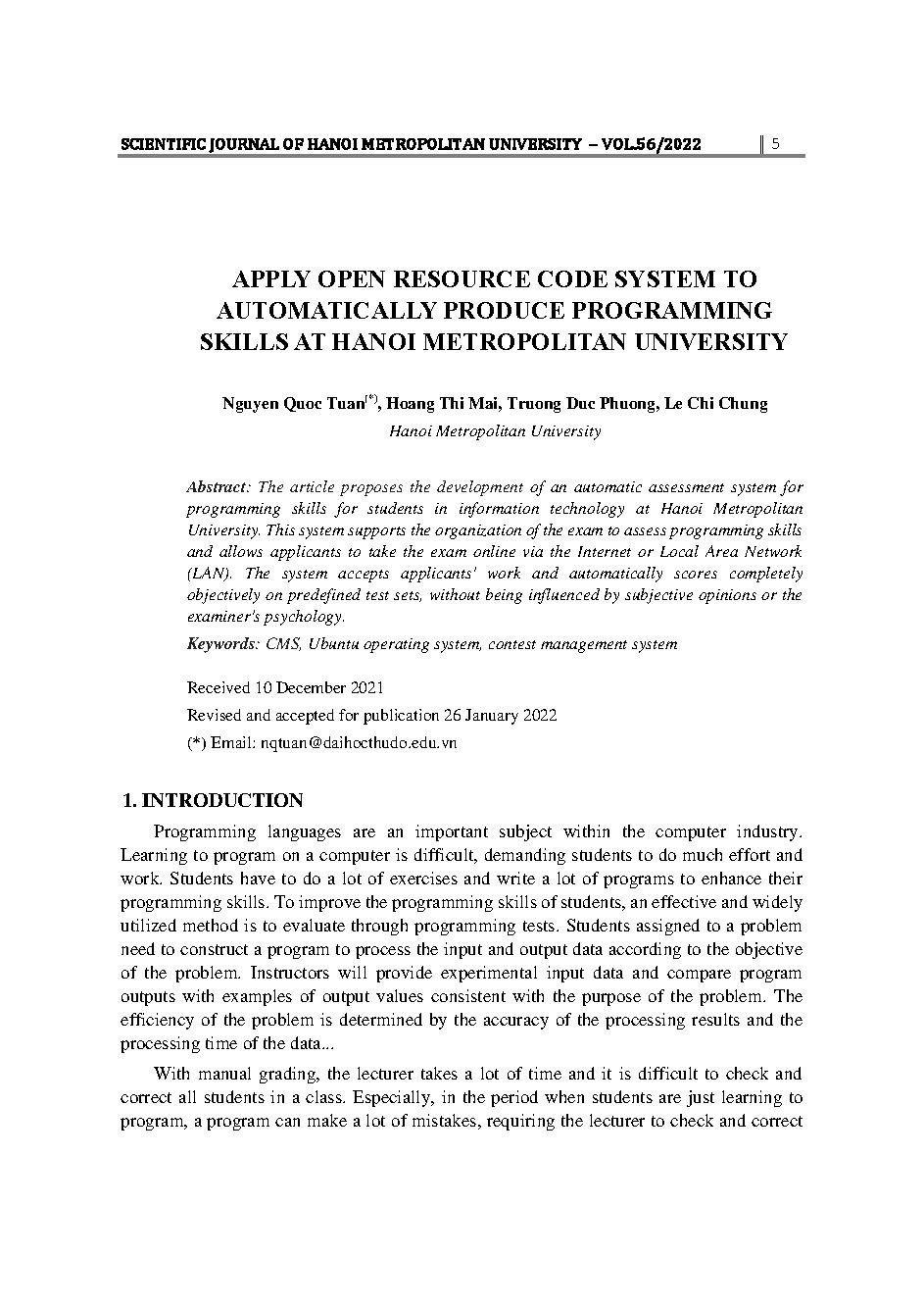 Ứng dụng hệ thống mã nguồn mở xây dựng hệ thống đánh giá tự động kỹ năng lập trình tại trường Đại học Thủ đô Hà Nội = Apply open resource code system to automatically produce programming skills at Hanoi metropolitan university