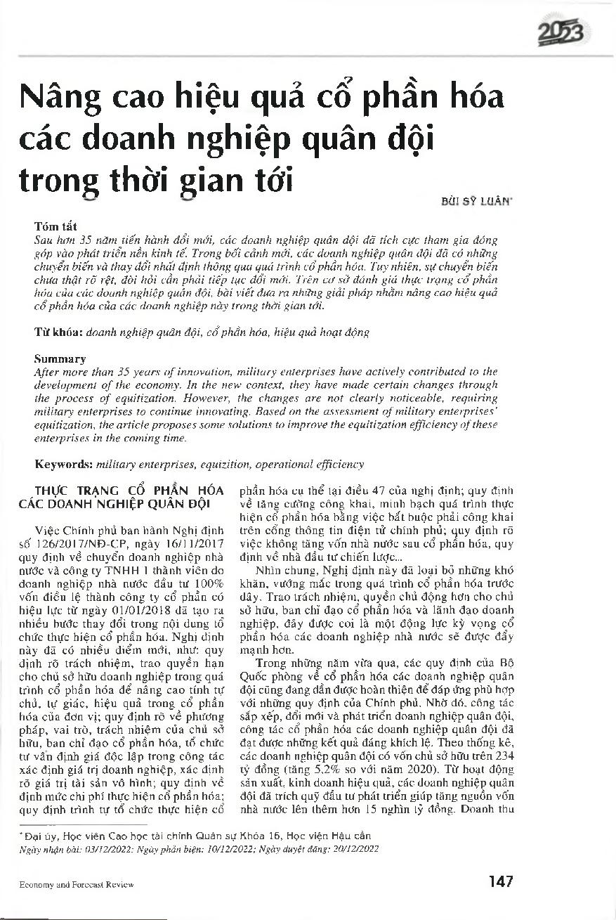 Nâng cao hiệu quả cổ phần hóa các doanh nghiệp quân đội trong thời gian tới = Improve the efficiency of equitization of military enterprises in the coming time