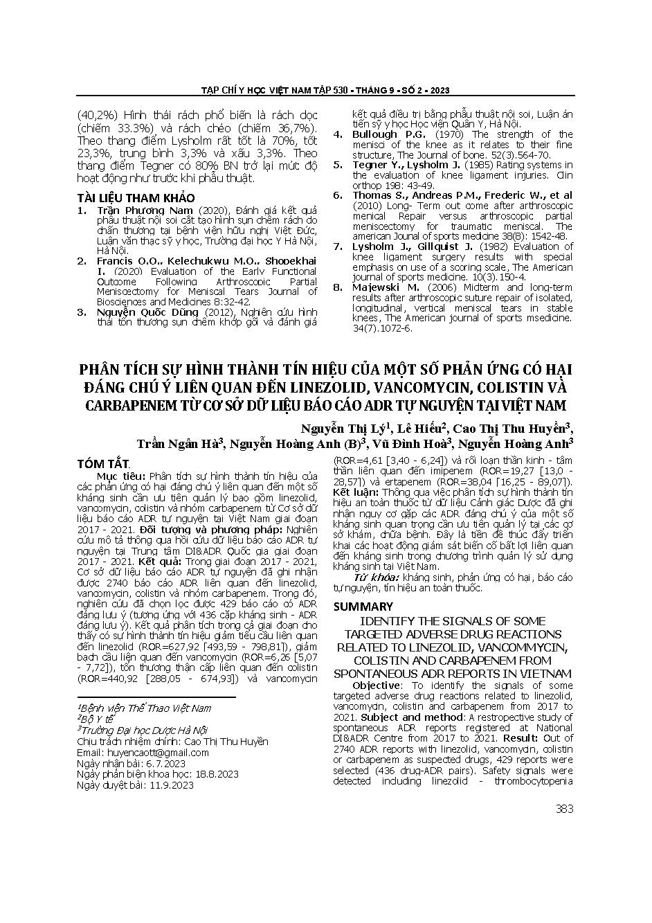 Phân tích sự hình thành tín hiệu của một số phản ứng có hại đáng chú ý liên quan đến linezolid, vancomycin, colistin và carbapenem từ cơ sở dữ liệu báo cáo adr tự nguyện tại Việt Nam = Identify the signals of some targeted adverse drug reactions related t
