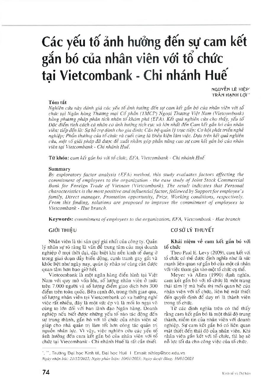 Các yếu tố ảnh hưởng đến sự cam kết gắn bó của nhân viên với tổ chức tại Vietcombank - Chi nhánh Huế = Determinants of employee commitment to the organization - Case study at Vietcombank - Hue Branch