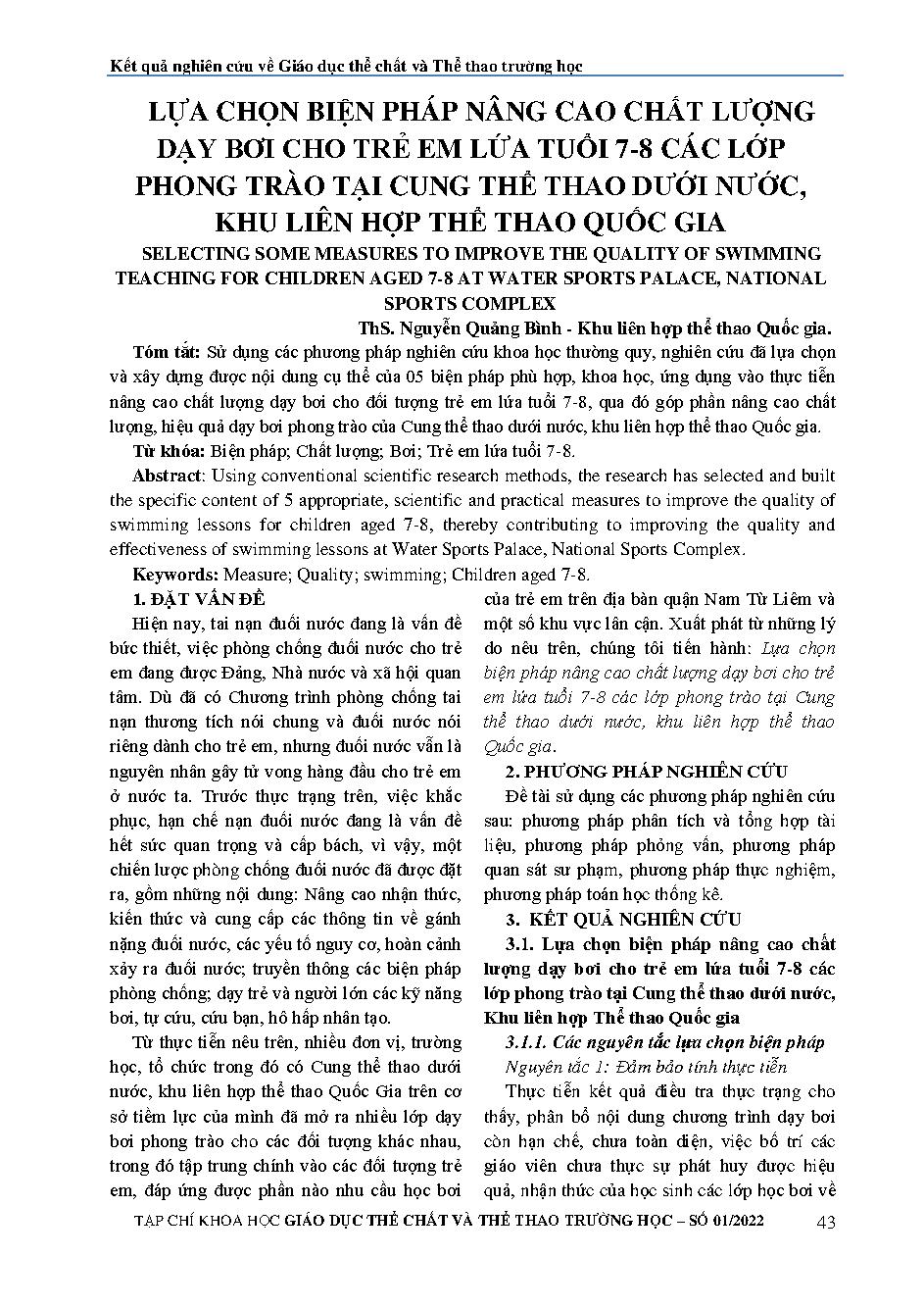 Lựa chọn biện pháp nâng cao chất lượng dạy bơi cho trẻ em lứa tuổi 7-8 các lớp phong trào tại Cung thể thao dưới nước, khu liên hợp thể thao quốc gia = Selecting some measures to improve the quality of swimming teaching for children aged 7-8 at Water Spor