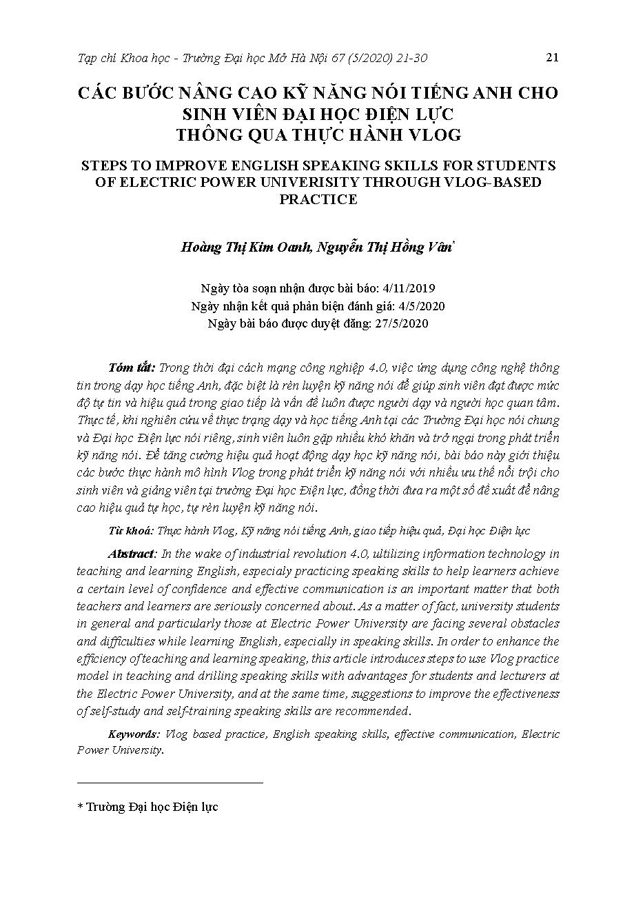 Các bước nâng cao kỹ năng nói tiếng Anh cho sinh viên Đại học Điện lực thông qua thực hành Vlog = Steps to improve English speaking skills for students of Electric power university through Vlog-based practice