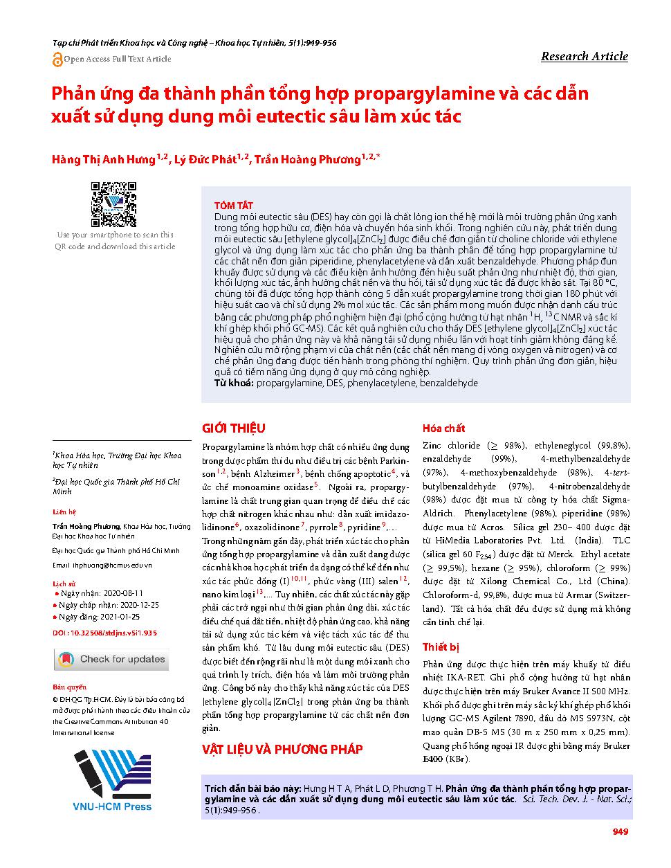 Phản ứng đa thành phần tổng hợp propargylamine và các dẫn xuất sử dụng dung môi eutectic sâu làm xúc tác