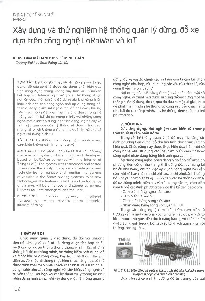Xây dựng và thử nghiệm hệ thống quản lý dừng, đỗ xe dựa trên công nghệ LoRaWan và loT = Dveloping and testing the parking management system based on LoRaWan and loT technology