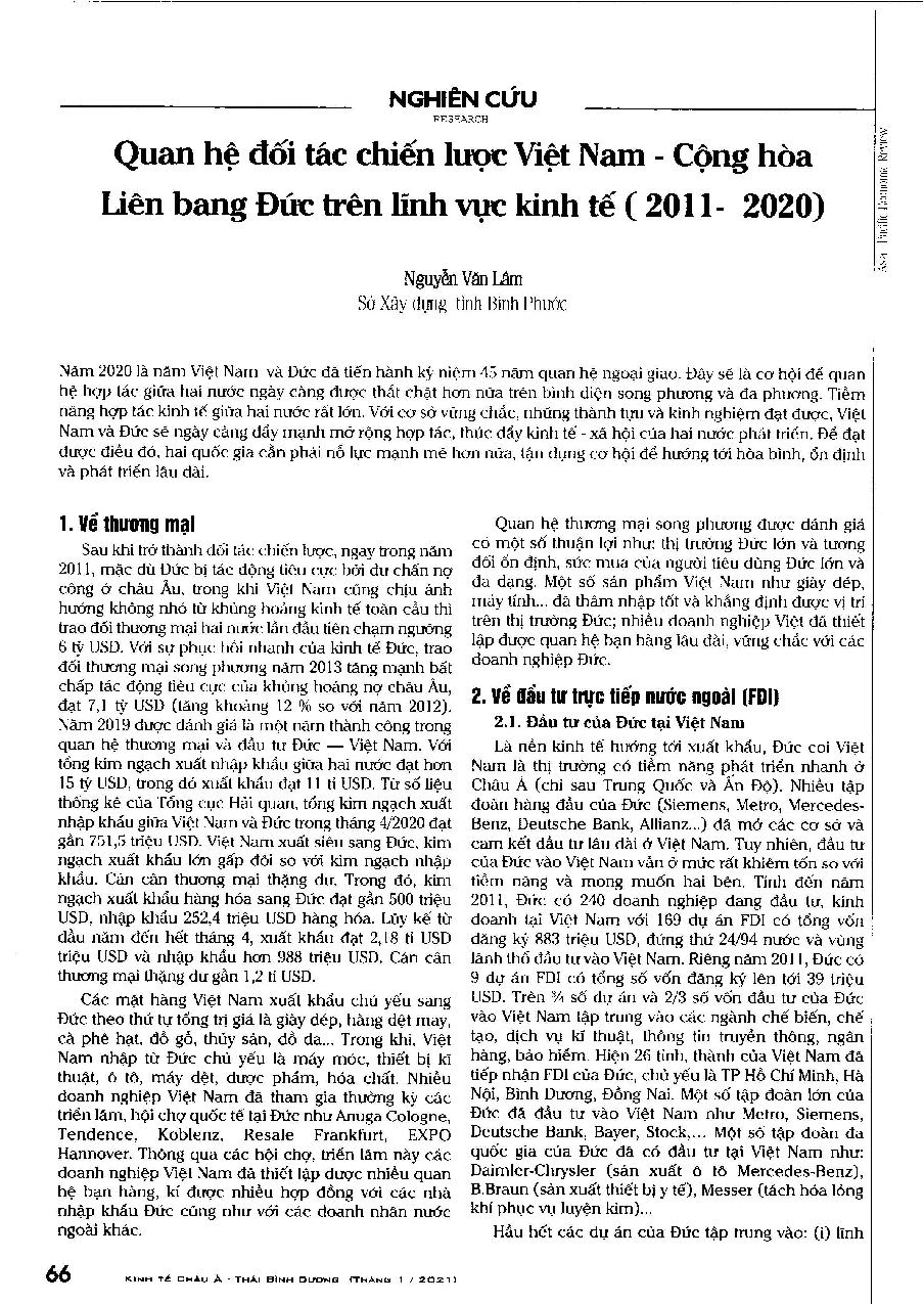 Quan hệ đối tác chiến lược Việt Nam - Cộng hòa Liên bang Đức trên lĩnh vực kinh tế ( 2011- 2020)