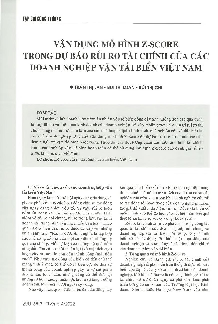 Vận dụng mô hình Z-Score trong dự báo rủi ro tài chính của các doanh nghiệp vận tải biển Việt Nam = Applying the Z-Score model to forecast financial risks of Vietnamese shipping companies