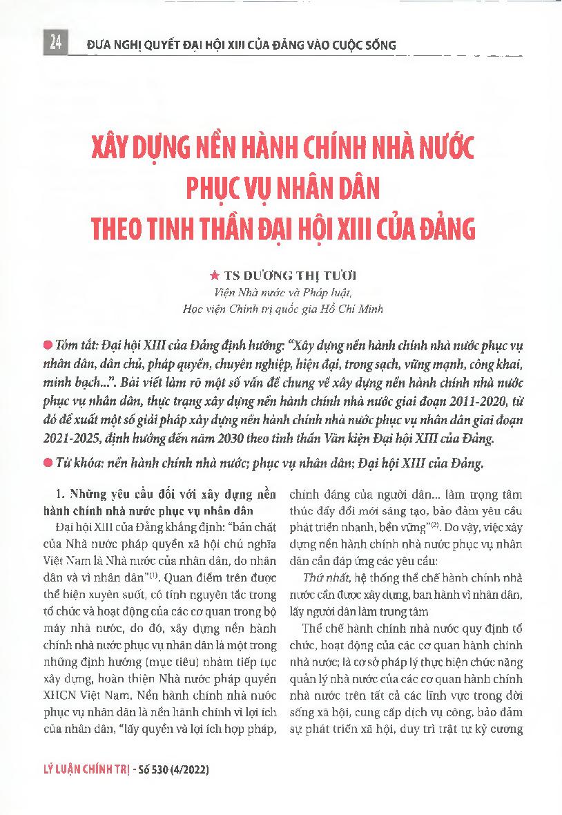 Xây dựng nền hành chính nhà nước phục vụ nhân dân theo tinh thần Đại hội XIII của Đảng = Building a state administration to serve the people in the spirit of the 13th Party Congress