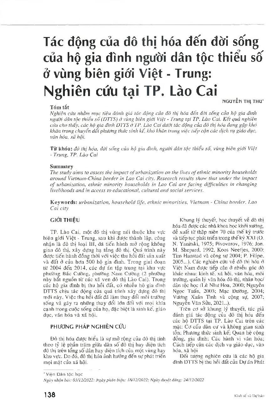 Tác động của đô thị hóa đến đời sống của hộ gia đình người dân tộc thiểu số ở vùng biên giới Việt - Trung: Nghiên cứu tại TP. Lào Cai = Impact of urbanization on the lives of ethnic minority households in Vietnam-China border: A study in Lao Cai